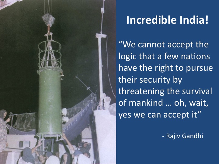 Plenty to look forward to this week, as the First Committee turns to the thematic debate on nuclear disarmament. We'll be keeping an eye on the rhetorical contortions of the P5: will any of them be able to top the UK's immortal line from the 2014 NPT PrepCom: "We consider that nuclear weapons have helped to guarantee our security, and that of our allies, for decades. We want a world without them..."? And then there's Incredible India - will we see this revealing quote from Rajiv Gandhi trotted out again?