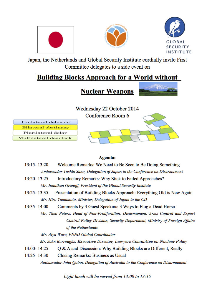 We heartily recommend this side-event hosted by Japan, the Netherlands and the Global Security Institute. Come and learn how "steps" that have utterly failed to be taken are magically transformed into a workable strategy when they are called "building blocks" instead. The difference? You can do the building blocks in any order... or not!