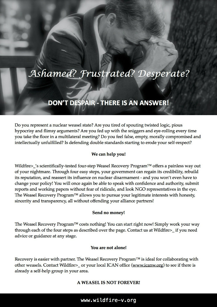 Anyway, please come and help our weasel friends pretend to do something in order to deflect unwelcome attention from their own dependence on nuclear weapons and reluctance to do anything about that.