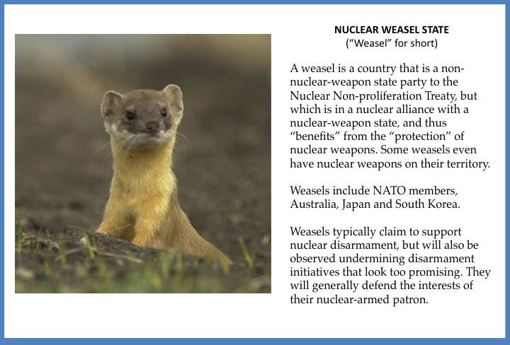 Australia is once again organising a weasel counter-statement to the New Zealand-led widely-supported statement on the humanitarian consequences of nuclear weapons. We were looking forward to having a good laugh at more weasel antics. But then this draft fell into our hands. It's quite remarkably insightful and constructive. Have the weasels actually paid attention to our Weasel Recovery Program? It seems too much to hope for - and yet there it is in black and white. Let's see how the final version comes out...